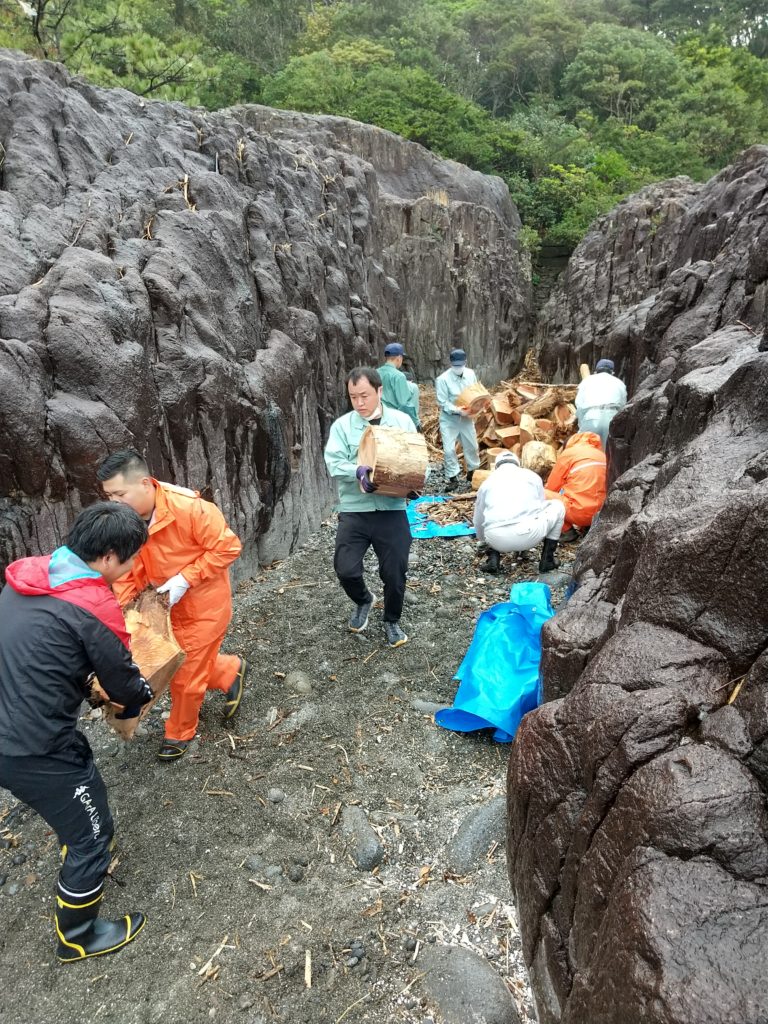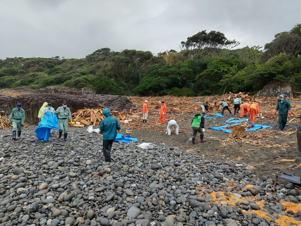 神武伝説が色濃く残る「フクトが浦」海岸(台風14号で打ち上げられた大量の流木等を人界戦略で焼却処分する県・市職員と地元住民の皆さん。